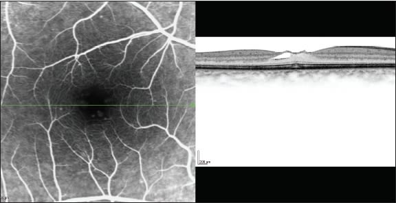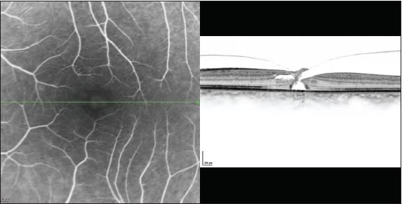 We report on a 62-year-old female patient who presented with a grade 2 macular hole in her left eye. Visual acuity in the affected eye was 20/200. Spectralis HR-OCT demonstrated the full-thickness hole with vitreal traction on the attached operculum and also elevation of the photoreceptor layer (Figure 1). Best corrected visual acuity in the right eye was 20/50. Spectralis HROCT demonstrated vitreomacular traction and a small foveal cyst, consistent with a grade 1 macular hole (Figure 2).