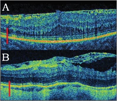 Figure 2. Spectral-domain OCT of epiretinal membranes. The red lines represent 100 μm. A. An elevated fovea contour in an eye with epiretinal membrane formation. B. Another case of an elevated fovea contour and distortion of particular retinal layers in an eye with ERMs.