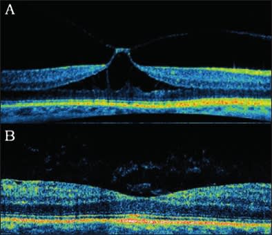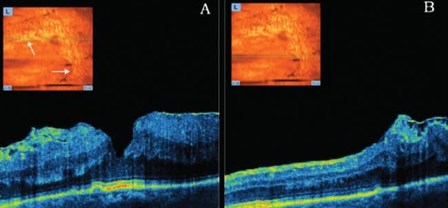 Figure 1. Situations preceding ERM formation. A. Vitreomacular traction on spectral-domain OCT. B. Condensation of the posterior hyaloid.