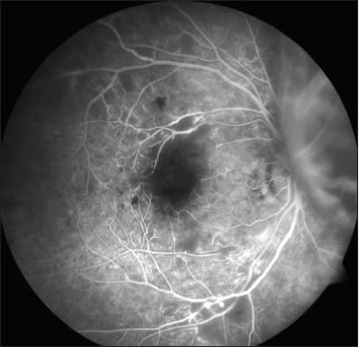 Figure 1. Midphase fluorescein angiogram showing severely enlarged foveal avascular zone.