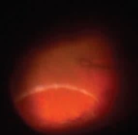 Figure 2. Image showing generous inferior peripheral iridectomy. This patient recovered 20/30 visual acuity after several retinal reattachment surgeries for retinal detachment and proliferative vitreoretinopathy. His silicone oil has been removed. Subtle droplets of silicone oil can be seen on the intraocular lens.