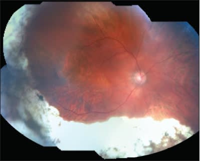 Figure 9. Montage fundus photograph of a retina following retinal detachment repair, with an inferior retinectomy and silicone oil tamponade following silicone oil removal. The eye has 20/30 visual acuity even though there are small oil droplets on the posterior-chamber intraocular lens (seen in Figure 2).