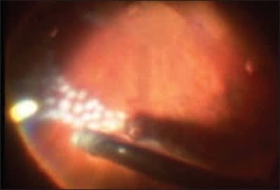 The development of perfluorocarbon liquids for use in vitreoretinal surgery by Stanley Chang, MD, revolutionized the treatment of complex retinal detachments.1 Perfluoron (perfluoro-n-octane; Alcon), transparent and heavier than water, facilitates intraoperative retinal attachment in a supine patient. Perfluoron's low viscosity makes it easy to inject into the eye and to manipulate during surgery.2 Its high boiling point allows the use of endolaser therapy through Perfluoron during surgery.3 Since laser photocoagulation does not form an immediate retinochoroidal adhesion, and since Perfluoron cannot be safely left in the eye postoperatively, gas or silicone oil must be exchanged for the Perfluoron once the retina is attached.4,5