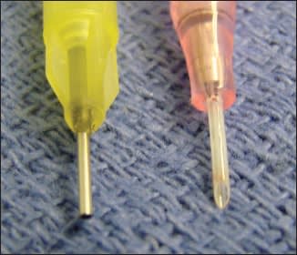 Figure 5. The cut edge of a 20-gauge angiocatheter has a larger inner diameter than the 20-gauge silicone oil needle.