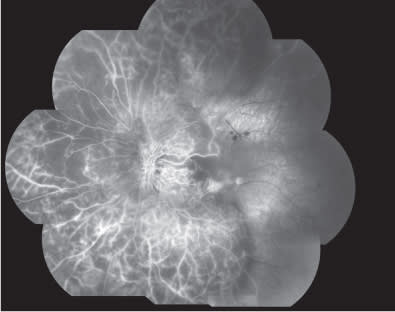 Figure 5. Composite fluorescein angiography in the early phases showing a delayed optic disc and arterial filling with extensive retinal ischemia involving both posterior pole and periphery.