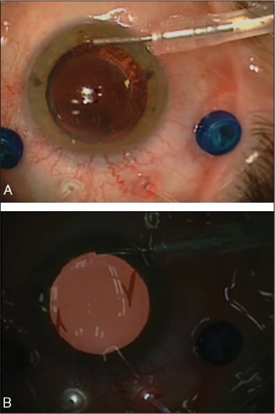The injection of these stains, administered into the vitreous chamber without stopping infusion, highlights the course followed by intraocular fluids when the Re-Flow technique is used. They are carried downward toward the posterior pole with neither turbulence nor dispersion (important detail for posterior pole staining) and straight fluid motion that does not require the temporary interruption of infusion, as occurs when it is performed by routine in the pars plana.
