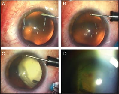 Figure 3. Evolution of the technique: “One pars plana port” vitrectomy with 25-g system. Use of slit lamp, one pars plana 25-g approach with 25-g anterior infusion in phakic patient (Annual ASRS Meeting, Montreal 2005): (A) Oblique inferior corneal tunnel with 25-g blade; (B) Infusion in the anterior chamber; (C) Triamcinolone injection without closing the infusion; the powder goes toward the posterior pole; (D) ILM peeling.