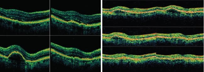 Figures 2 and 3. One benefit derived from the data acquisition speed of spectral domain OCT is the ability to register scans with a fundus image, which improves the precision of patient monitoring from visit to visit.