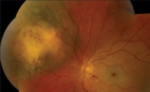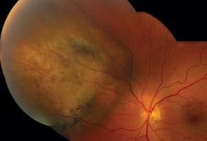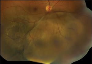Figure 2. Large inferior uveal melanoma with associated serous retinal detachment. Many clinicians are currently treating these patients with plaque therapy to improve their quality of life since their long-term survival is likely not affected by the local therapy they receive.