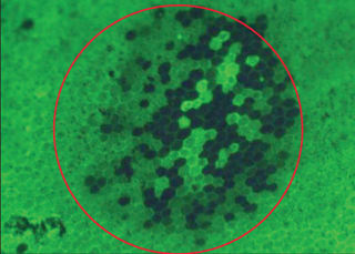 Porcine RPE following 2RT laser treatment. Calcein-AM was used to visualize living RPE cells (green) and dead RPE cells (black) within the Ellex 2RT treatment spot (red circle). Cell membranes are not ruptured and no collateral damage is caused to photoreceptors.