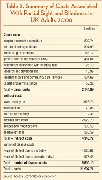 More recent data for 2008 state the economic costs of partial sight and blindness on the United Kingdom total £22 billion, with direct healthcare costs amounting to £2.14 billion. This research estimated that there were a total of 1.8 million people with partial sight and blindness in the UK adult population in 2008, with 3.5% from diabetic retinopathy.25