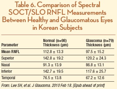 For glaucoma or optic nerve studies, the retinal nerve fiber layer OCT program used by this system acquires an average of several 3.4-mm diameter optical disc scans in order to measure the NFL thicknesses, and displays their relation to database standards. A study of Korean subjects with healthy (n = 98) and glaucomatous (n = 79) eyes reported an average RNFL thickness of 112.8 ± 13.3 and 97.5 ± 15.2 µm, respectively (Table 6). The authors also reported an excellent reproducibility of RNFL thickness measurements based on ICC values between 0.92 and 0.99.53