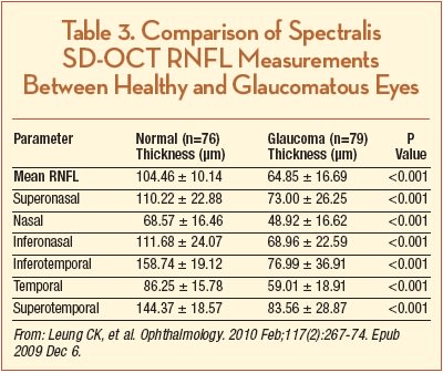 Another study compared the repeatability of RTVue-100 to a well-established device for following glaucoma patients, scanning laser polarimetry (GDx), for imaging RNFL thickness measurements in one eye of each of 37 participants (14 normal and ocular hypertensive subjects, 11 patients with moderate glaucoma, and 12 with severe glaucoma). The average RNFL thickness coefficient of variation was lower with RTVue (2.11%) than with GDx-ECC (3.22%, P=.004), for all participants, indicating that repeatability of RTVue SD-OCT is better than that of GDx.47
