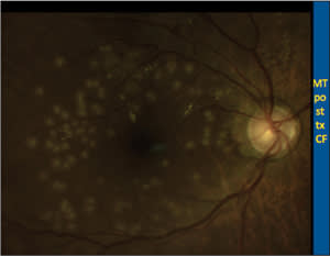 Figure 2. Fundus photograph after treatment shows precise localization of burns at areas of microaneurysms or targeted areas.