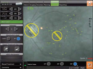 The areas that are to be treated appear as small white circles on top of the patient's live fundus image. If the eye moves, the planned position and aiming beam stays with it. If the patient closes the eye or the image is not overlaid correctly, the system will not treat. This is called registered imaging and treatment. "The laser is really semiautomatic. You have already planned yourself or with the photographer where you want to treat. That treatment plan is overlaid onto the patient's retina, and the laser beam auto advances to the first and subsequent points to treat. You see an aiming beam on top of your first point on the retina," says Dr. Freeman. Once the doctor confirms that that point is correct, he or she hits the pedal, and that area is treated and the laser moves to the next mark. It will beep once it locks onto the next target. The physician, however, fully controls the application of each laser pulse.