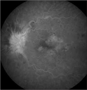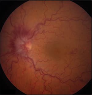 Figure 3. Fundus photograph of the left eye shows CRVO with evidence of venous congestion in all four quadrants. |