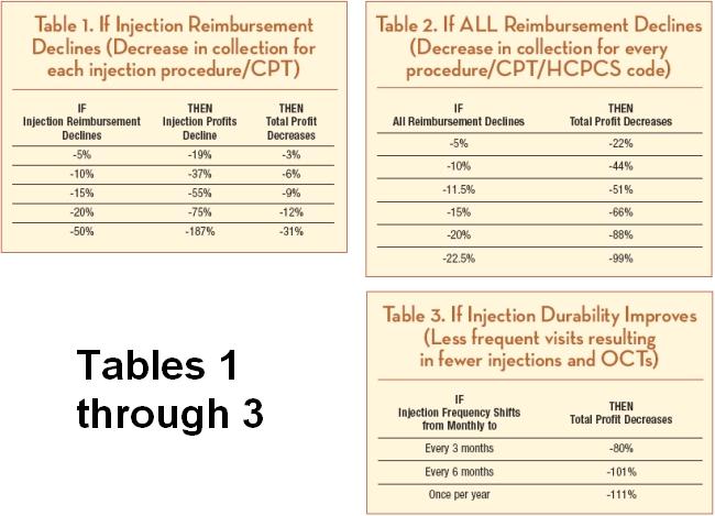 Changes in clinical practices can also have a profound effect. If wet AMD treatments were to shift from monthly injections to a longer interval (every quarter or once per year), the practice would see a considerable reduction in office visits, imaging procedures, injection procedures, and drug revenue. A significant reduction in the number of these services (and associated revenue/profit) would quickly eliminate all profits or result in financial loss to the practice. This is due to the significant costs (mostly labor, office space, equipment costs, etc.) that we have devoted to providing these services. Obviously, it would prompt a careful examination of how we might restructure to address these changes.