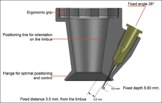 To use the device, the physician places the InVitria on the patient's eye with the help of a positioning line in the center that should be aligned with the limbus. Corneal diameter is not a factor, Dr. Gonçalves says, because positioning does not depend on the center or the size of the cornea. The physician then gently pushes down and rotates the device. This fixates the eye, and the patient feels an anesthetic effect due to the pressure. "Turning the InVitria causes displacement of the conjunctiva and gives a stepped injection hole after removing the needle," Dr. Gonçalves explains.
