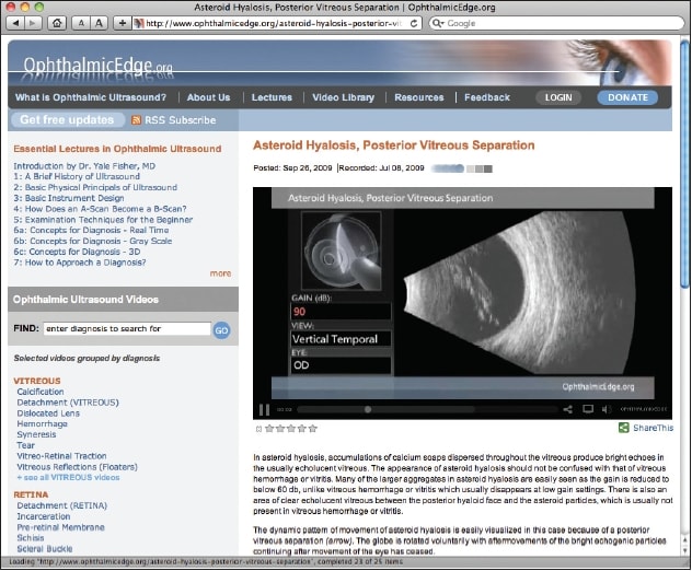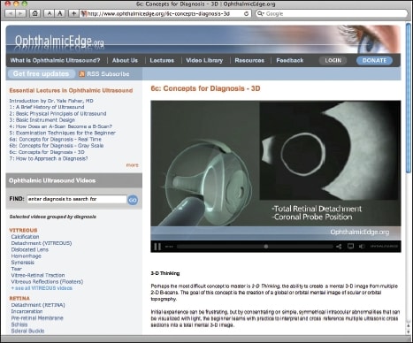 The site has two major divisions: a series of short lectures and a video library. Lectures are designed for participants with an understanding of ophthalmic anatomy and pathology but little or no knowledge of Contact B-scan ultrasonography.