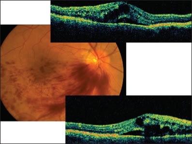 Figure 2. Branch retinal vein occlusion with macular edema and exudative foveal detachment: clinical photograph and OCT images.