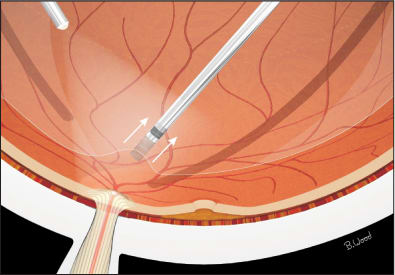 Many retinal surgeons use a lateral motion of the extrusion cannula, soft-tip cannula or vitreous cutter to create a PVD. This method creates shear force at the vitreous base, potentially leading to iatrogenic retinal breaks. A better method is to position the vitreous cutter at the nasal, superior, and inferior margins disk margins, with the port oriented away from the center of the disk, and to pull anteriorly (toward the cornea), using the vacuum-only mode (Figure 1). The anterior-pull disk-margin method safely, reliably and quickly produces a PVD using 25-g cutters. It is a huge misconception that higher flow rates help produce PVDs or that 25-g cutters cannot produce a PVD; it is all about technique.