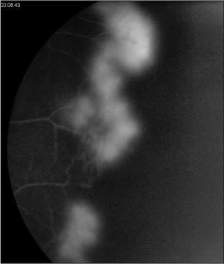 Figure 3. Leakage from peripheral retinal neovascularization, left eye.
