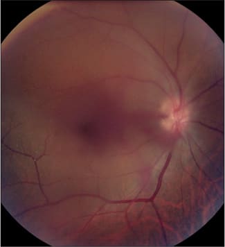 A 52-year-old African-American male presented to the Wills Eye Institute with a two-day history of blurred vision described as a “black cobweb” in his right eye. He denied any past ocular history and did not have any photopsia or eye pain. His past medical history was significant only for prostate cancer, for which he was undergoing chemotherapy. He was otherwise not on any outpatient medications and specifically denied having diabetes or hypertension. The social history was remarkable for two decades of intravenous drug abuse, now in remission for several years. A thorough review of systems was otherwise negative.