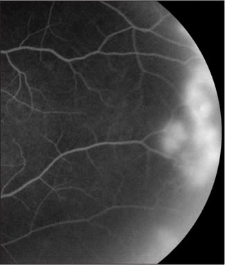 Figure 5. Late blocking effect on FA due to vitreous hemorrhage, right eye.