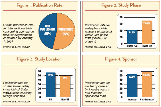 A recent presentation at the American Society of Retina specialists by Prenner and colleagues investigated the issue of selective publication for the field of retina. A comprehensive search of all trials on ClinicalTrials.gov concerning age-related macular degeneration was performed. Interventional trials concerning AMD completed by January 1, 2007 (to allow time for publication) were included; of 386 candidate trials, 64 met inclusion/exclusion criteria. The overall publication rate was 54%. Industry sponsored trials were published at a slightly lower rate (52%) than were non-industry sponsored trials (58%). Early phase 1 or 2 trials were published at a rate of 42% (n=36), slightly lower than the 71% rate (n=28) of Phase 3 and 4 trials, p=0.02. Whether trials were foreign or domestic did not statistically significantly influence publication rate.