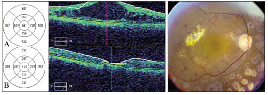 A: Horizontal scans through the fovea show distortion of the normal foveal contour with a very large intraretinal cyst. The retinal map shows a central foveal thickness of I073 μm. Best-corrected visual acuity was 20/400.