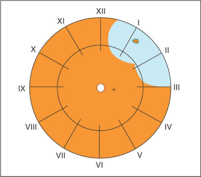 Figure 9. A visual field examination 12.5 years after surgery revealed an absolute scotoma consistent with the extent of the retinal elevation at the time of surgery.