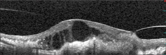 In eyes where there were clear vitreomacular traction and resistance to multiple injections of anti-VEGF drugs, we offered surgery to remove the adhesion. In all cases, during vitrectomy with a 20- or 25-gauge vitrector, we were able to demonstrate a vitreomacular adhesion when it was seen on SLO/SD-OCT. This was demonstrated with the soft-tip infusion cannula. In some eyes the retina was extremely edematous, (Figure 2). In such eyes, the inner retina can be thin and the cyst can be ruptured, possibly leading to a macular hole. It is important, therefore, in these eyes to exercise great caution in areas of cystic formation, such as are commonly seen in chronic cases that have not responded well to anti-VEGF therapy or which have had multiple recurrences after interruptions of therapy. In all cases, we continued with intravitreal anti-VEGF therapy at the conclusion of the case and every four weeks thereafter. In eyes receiving bevacizumab (Avastin, Genentech) therapy, we use double-dose bevacizumab (necessitating 0.1-mL volumes) injections every four weeks postoperatively.