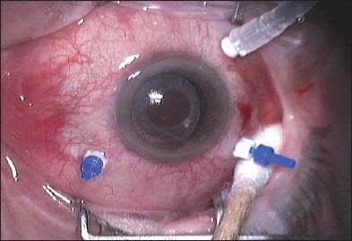 4. Keeping the horseshoe marker in place, create a 25-g transconjunctival puncture with the left hand. Remove the needle from the eye, but do not look away from the puncture wound!