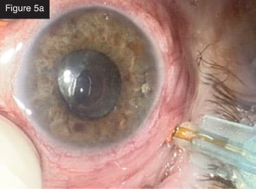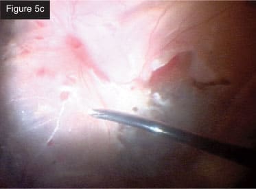 Final view. CASE 5: Severe PVR with subretinal membranes. In this case, the eye was filled with silicone oil. The eye already had several surgeries, but the conjunctiva looked good. I removed the oil (Figure 5a) and then went under the retina to remove large sheets of subretinal membrane that had collected all the way around (Figures 5b and 5c). While doing this case, I was impressed with the lighting on the CONSTELLATION® System and how well I could visualize tissue at all times. I performed a fluid-air exchange and aspirated with the same probe through the retinotomies. After applying laser to the breaks, I injected silicone oil. I performed all of these maneuvers in a smooth, seamless, efficient manner with minimal exchange of instruments and with total IOP control throughout. These few cases represent the many complex pathologies that can be treated using the CONSTELLATION® Vision System.