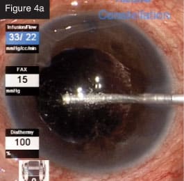 Bidirectional laser to breaks. CASE 4: Tractional detachment in silicone-filled eye. Silicone oil removal and injection can be done beautifully through small gauge with the CONSTELLATION® System. In this case, I entered through the limbus to remove droplets of emulsified silicone oil from the anterior chamber (Figure 4a). Then, I used forceps to lift the membrane that was causing the tractional detachment (Figure 4b). After lifting off the membrane, I was able to remove everything with the cutter (Figure 4c). I still utilize forceps in some cases, but I use them less often with this technology.