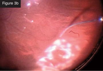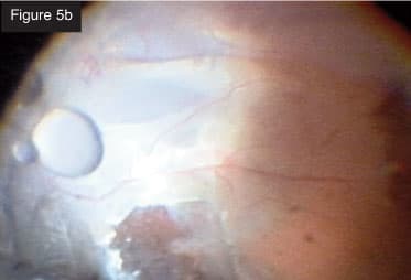 Membrane removal with vitrector. CASE 3: Total rhegmatogenous retinal detachment. I frequently combine scleral buckling with small-gauge vitrectomy. In a recent case of total rhegmatogenous retinal detachment (Figures 3a and 3b), I first did the scleral buckle and then removed the vitreous from the periphery with minimal traction on the retina. The creation of iatrogenic breaks is markedly reduced with this technology. I injected perfluorocarbon liquid and aspirated subretinal fluid. I like to aspirate often with the vitrectomy probe through the break. Next, I applied laser photocoagulation to the break. With the flexible tip laser probe, I find I can treat that entire area in an elegant, quick way, even in phakic