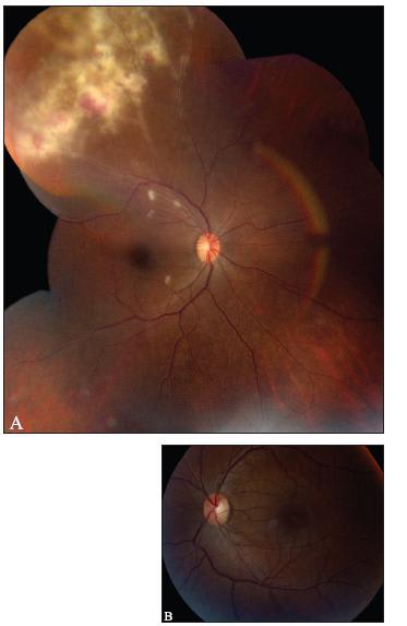 Figure 1. Fundus photos demonstrating fulminant CMV retinitis and early perivascular disease in the superior periphery, with cotton wool spots in the macula of the right eye (A). Posterior pole of the left eye appears normal (B).