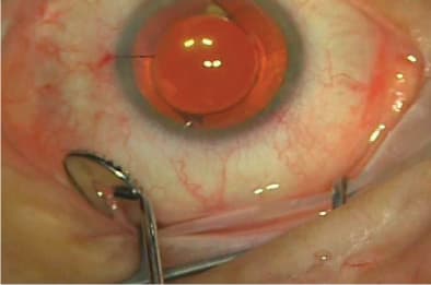 To achieve this, the surgeon should displace the conjunctiva before inserting the trocar. In addition, to make the chord length in the sclera as long as possible, I like to flatten the sclera with a broad stabilizing device on insertion of the trocar (Figures 1 and 2). This can be done with a cotton swab or with inserters. Finally, make the angle as oblique as possible to the sclera. The result is a wound that is not even visible, compared to the obvious wound gap and leakage found with straight incisions.