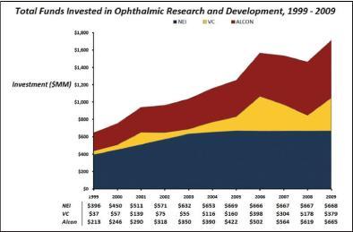 Figure 1. Total R&D funds by sector: National Eye Institute (NEI), venture capital (VC) and Alcon. While Alcon is the largest dedicated ophthalmology company, and its annual R&D investment now exceeds that of the NEI, the total investment from all public companies involved in ophthalmic R&D is much larger.
