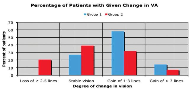 Figure 2. Despite continued improvements in retinal thickness, improvements in visual acuity in the DME trial plateaued at two to four months.