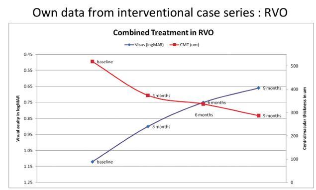 Figure 3. Combination therapy for RVO resulted in continuing increases in visual acuity and decreases in central retinal thickness.