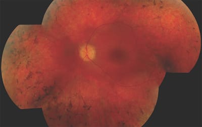Figure 3. At age 28 years, the retina of the left eye of patient 1 (CEP290 mutations) shows a relatively normal optic disc, narrow arterioles and a normal macula. The periphery shows hypopigmentation with intra-retinal bone spicules.