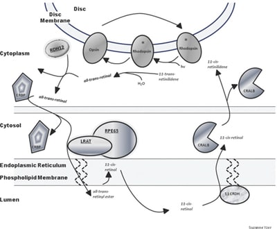 The visual cycle, also known as the retinoid cycle, is a pathway in which the photoactivation of rhodopsin and cone pigments causes isomerization of 11-cis-retinal to all-trans-retinal. This is a cyclical process, because all-trans-retinal is then recycled to 11-cis-retinal. Three genes (RPE65, RDH12, and LRAT), encoding proteins that play important roles in the visual cycle, can cause LCA when mutated. LRAT (lecithin retinol acyltransferase) and RPE65 (retinal pigment epithelium–specific protein) are two key components of the visual cycle.