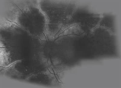 Figure 5. Autofluorescence image of the left eye of a patient with mutations in CRB1. Note the para-arteriolar sparing of the RPE with normal autofluorescence along the arterioles.