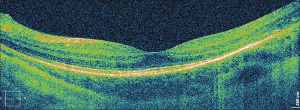 Figure 5. The same eye as shown in Figure 2A after scleral buckling surgery. A res toration of the line representing the junction of inner and outer segments of photoreceptors is visible.