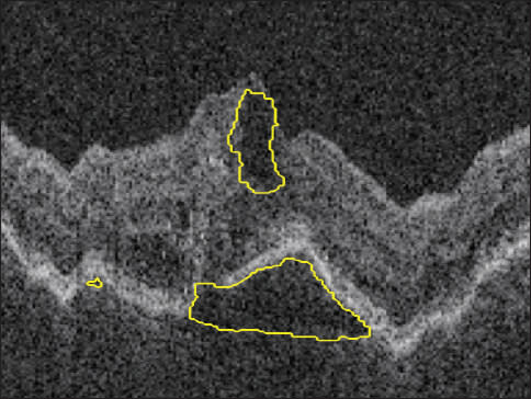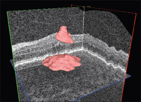 Figure 2. Automated quantification (above) and localization intraretinal and subretinal (below) fluid in a patient with AMD and choroidal neovascularization.