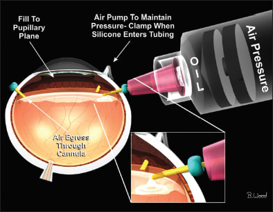 Figure 4. Following FAX and IDS and usually retinopexy, a silicone injector, such as the Alcon VFC, is used to inject silicone oil through a short, thin-wall cannula, while air through the infusion cannula maintains IOP, and air egress occurs with an extrusion cannula behind the lens/IOL or in the anterior chamber of aphakic eyes. The injection is stopped and the infusion line clamped with a hemostat when silicone enters the infusion cannula.