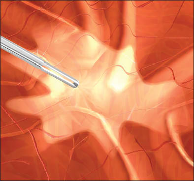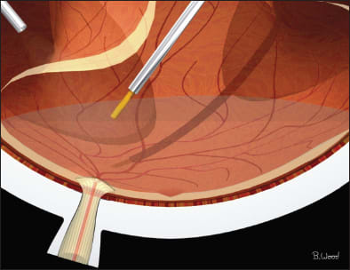 Figure 5. PFO injection over the optic nerve with a 25-gauge dual-bore cannula. ALL IMAGES ORIGINALLY APPEARED IN: CHARLES S, CALZADA J, WOOD B. VITREOUS MICROSURGERY. 5TH ED. PHILADELPHIA, PA; LIPPINCOTT, WILLIAMS & WILKINS; 2011. IMAGES APPEAR COURTESY OF WOLTERS KLUWER HEALTH.