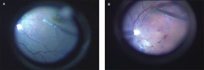 Figure 4. Peeling of epiretinal membrane (A) and internal limiting membrane (B) in a patient with MF.