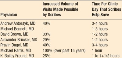 | Retina specialists are quick to point out how much scribes improve the quality of physician-patient interactions. “The patient appreciates the care you can provide when you're working with a scribe,” says Michael Harris, MD, a partner at Associated Retinal Consultants of Kenilworth, NJ. “Even though the exam time may be reduced, the amount of time you spend directly interacting with the patient is increased. You can't use numbers alone to quantify this type of improvement.” Nonetheless, numbers that represent increased productivity and time savings make these improvements possible. Below are average figures reported in these critical areas by several physicians.